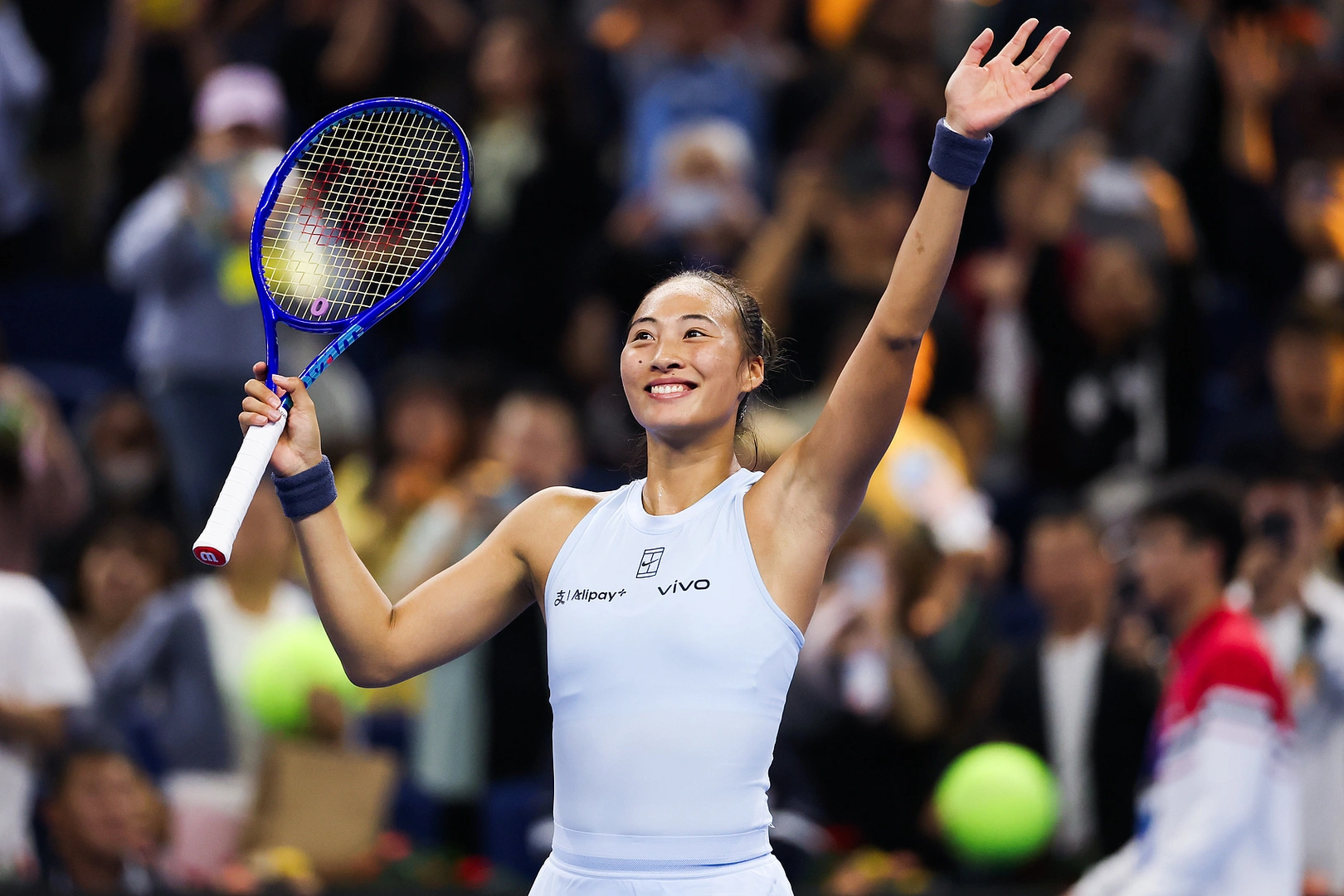 现场球迷瞬间欢呼起来,高举手中标语:“郑钦文,我们永远支持你。”