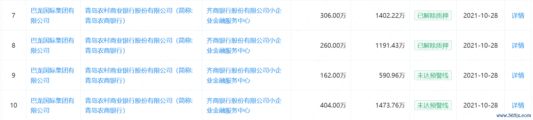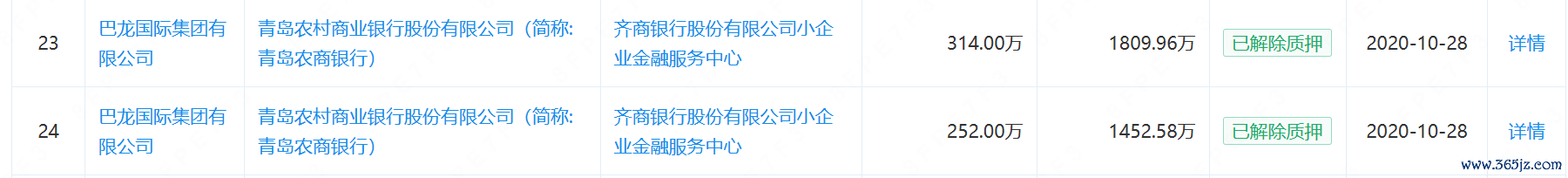 2020年10月28日华锋优配快线,巴龙集团分别将所持青农商行314万股、252万股股份,质押给齐商银行小企业金融服务中心,对应质押金额分别为1810万元、1453万元,后续均已解除质押 。2021年10月28日,该公司再次向齐商银行股份有限公司小企业金融服务中心质押306万股(对应1402万元 )、260万股(对应1191万元 ),这两笔质押已解除;另外质押的162万股(对应591万元 )、404万股(对应1474万元 ),尚处于“未达预警线”状态 。
