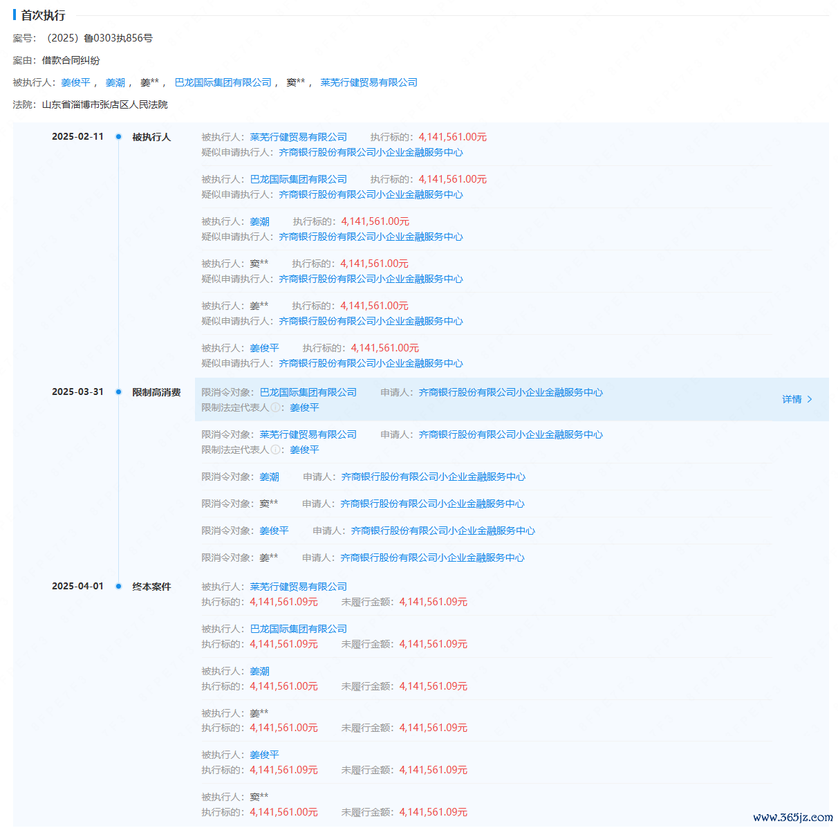 2月11日,莱芜亨捷贸易有限公司、巴龙集团、窦俊平、窦鹏等被列为被执行人,执行标的均为414.2万元,被执行人履行情况为“全部未履行”,超期申请执行人为齐商银行小企业金融服务中心。