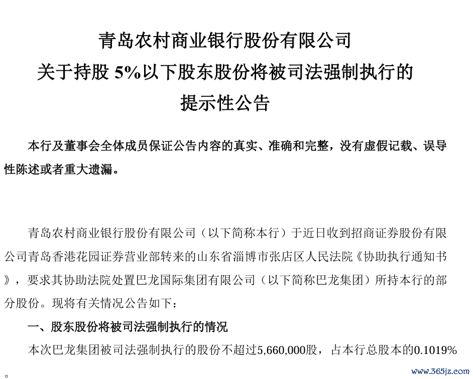 6月4日,青农商行(002958)发布公告称,近日收到招商证券青岛香港花园证券营业部转来的山东省淄博市张店区人民法院《协助执行通知书》,要求其协助法院处置巴龙国际集团有限公司(下称“巴龙集团”)所持该行的部分股份。